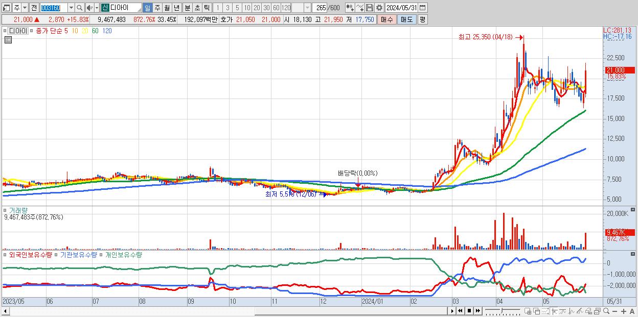- 디아이 (21,000원 ▲ 15.83% , 시총: 5,943억, 거래량: 9,467,483, 거래대금:1,921억)