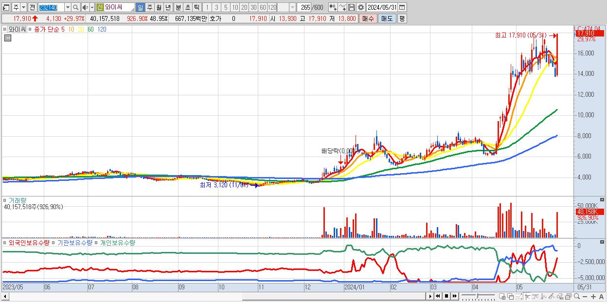 - 와이씨 (17,910원 ▲ 29.97% , 시총: 14,694억, 거래량: 40,157,518, 거래대금:6,671억)
