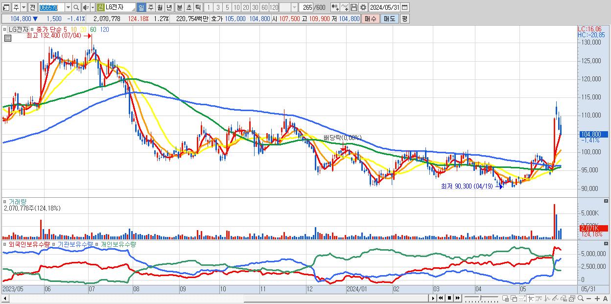 - LG전자 (104,800원 ▼ -1.41% , 시총: 171,503억, 거래량: 2,070,778, 거래대금:2,208억)