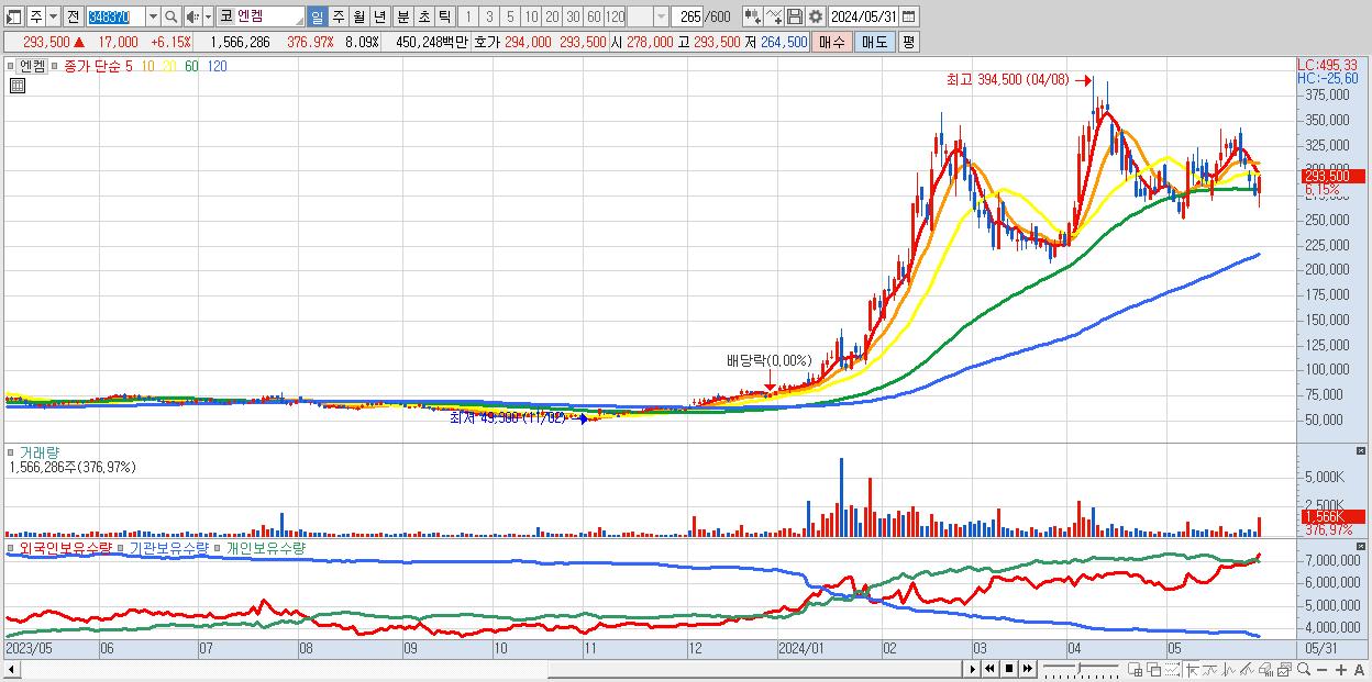 - 엔켐 (293,500원 ▲ 6.15% , 시총: 56,815억, 거래량: 1,566,286, 거래대금:4,502억)