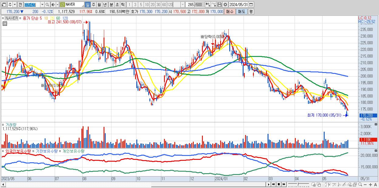 - NAVER (170,200원 ▼ -0.12% , 시총: 276,419억, 거래량: 1,117,529, 거래대금:1,905억)
