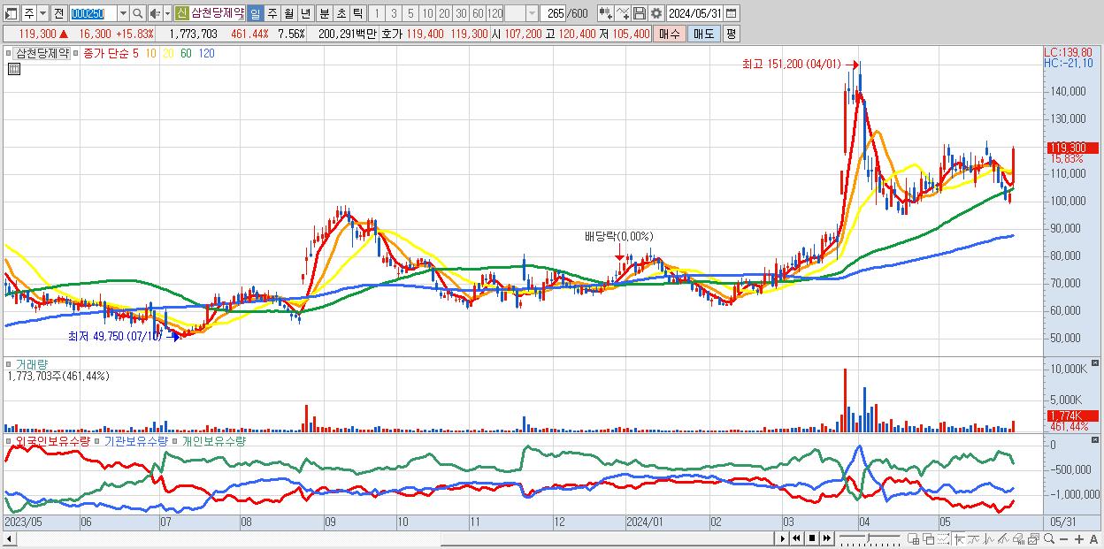 - 삼천당제약 (119,300원 ▲ 15.83% , 시총: 27,985억, 거래량: 1,773,703, 거래대금:2,003억)