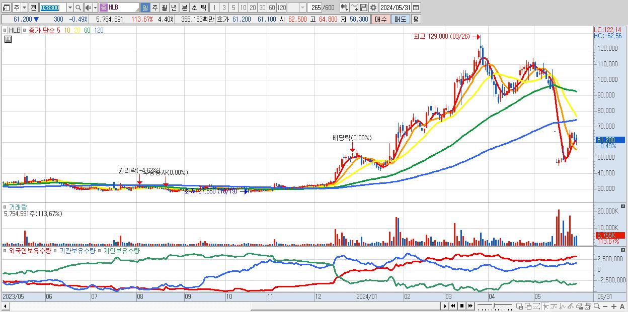 - HLB (61,200원 ▼ -0.49% , 시총: 80,077억, 거래량: 5,754,591, 거래대금:3,552억)