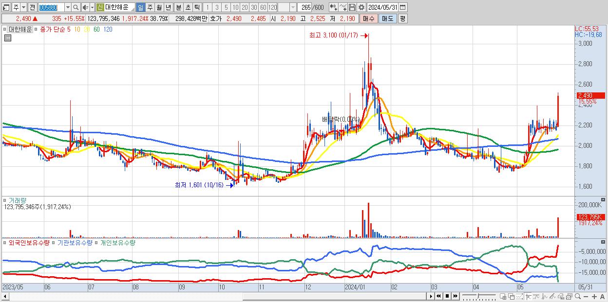 - 대한해운 (2,490원 ▲ 15.55% , 시총: 7,948억, 거래량: 123,795,346, 거래대금:2,984억)