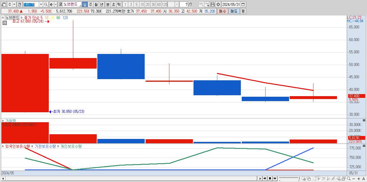 - 노브랜드 (37,400원 ▲ 5.5% , 시총: 2,862억, 거래량: 5,612,706, 거래대금:2,213억)