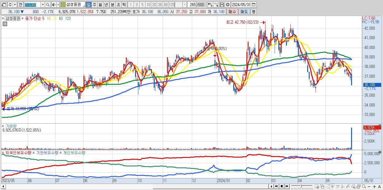 - 삼성증권 (36,100원 ▼ -2.17% , 시총: 32,237억, 거래량: 6,925,076, 거래대금:2,512억)