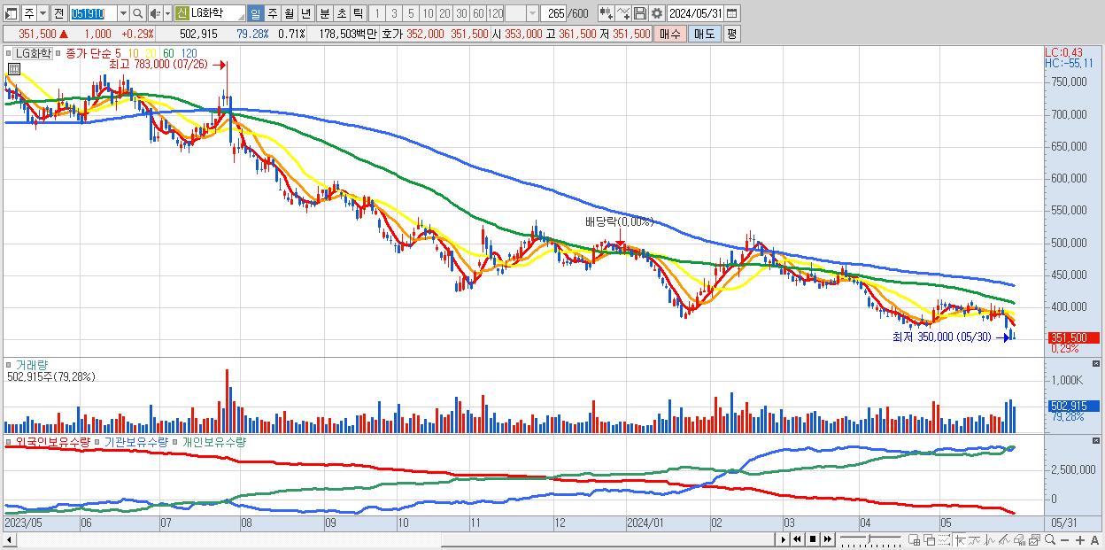 - LG화학 (351,500원 ▲ 0.29% , 시총: 248,132억, 거래량: 502,915, 거래대금:1,785억)
