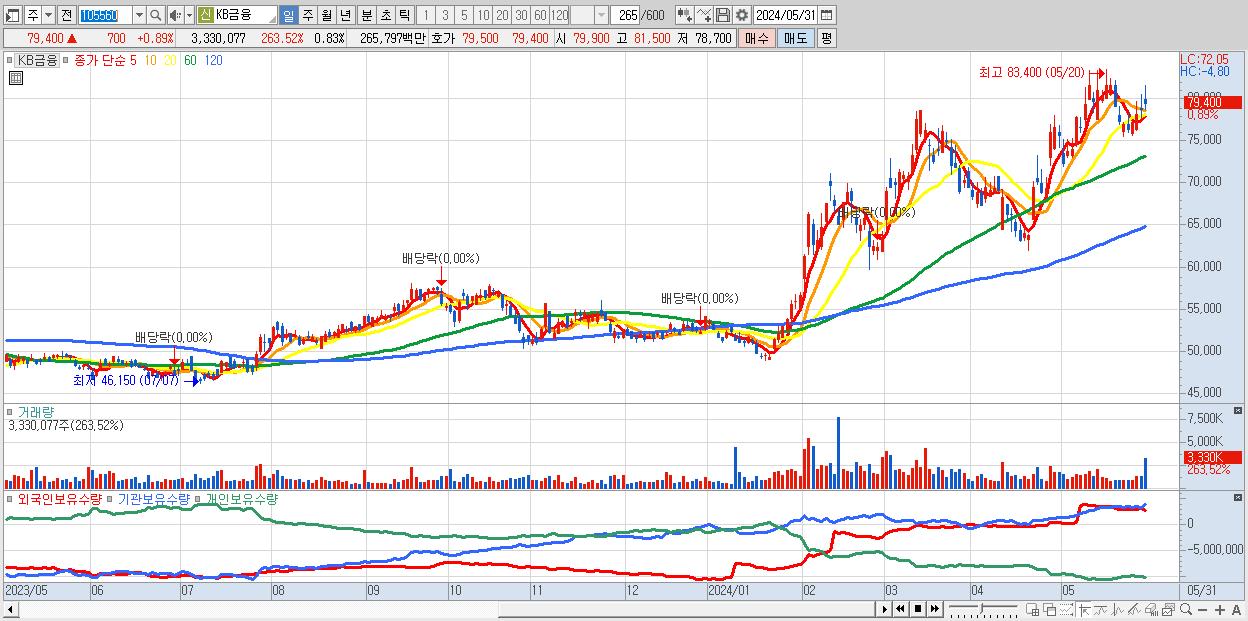 - KB금융 (79,400원 ▲ 0.89% , 시총: 320,388억, 거래량: 3,330,077, 거래대금:2,658억)