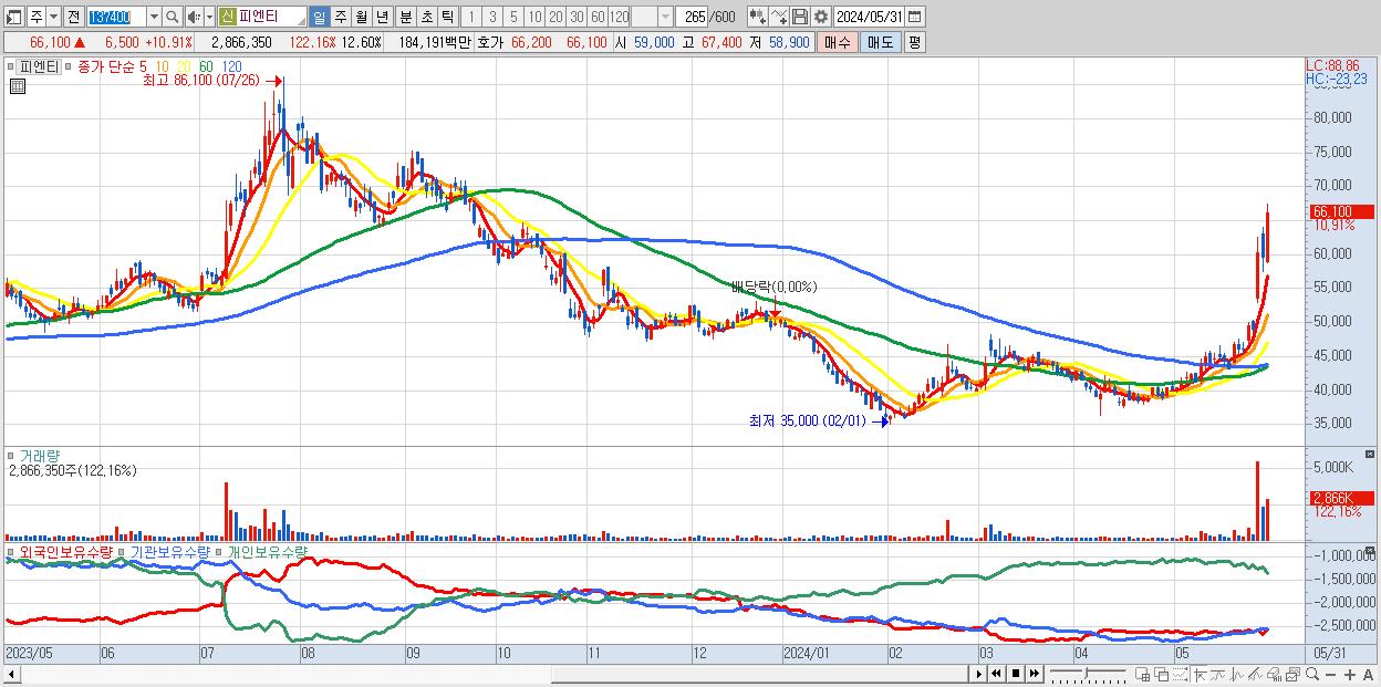 - 피엔티 (66,100원 ▲ 10.91% , 시총: 15,032억, 거래량: 2,866,350, 거래대금:1,842억)