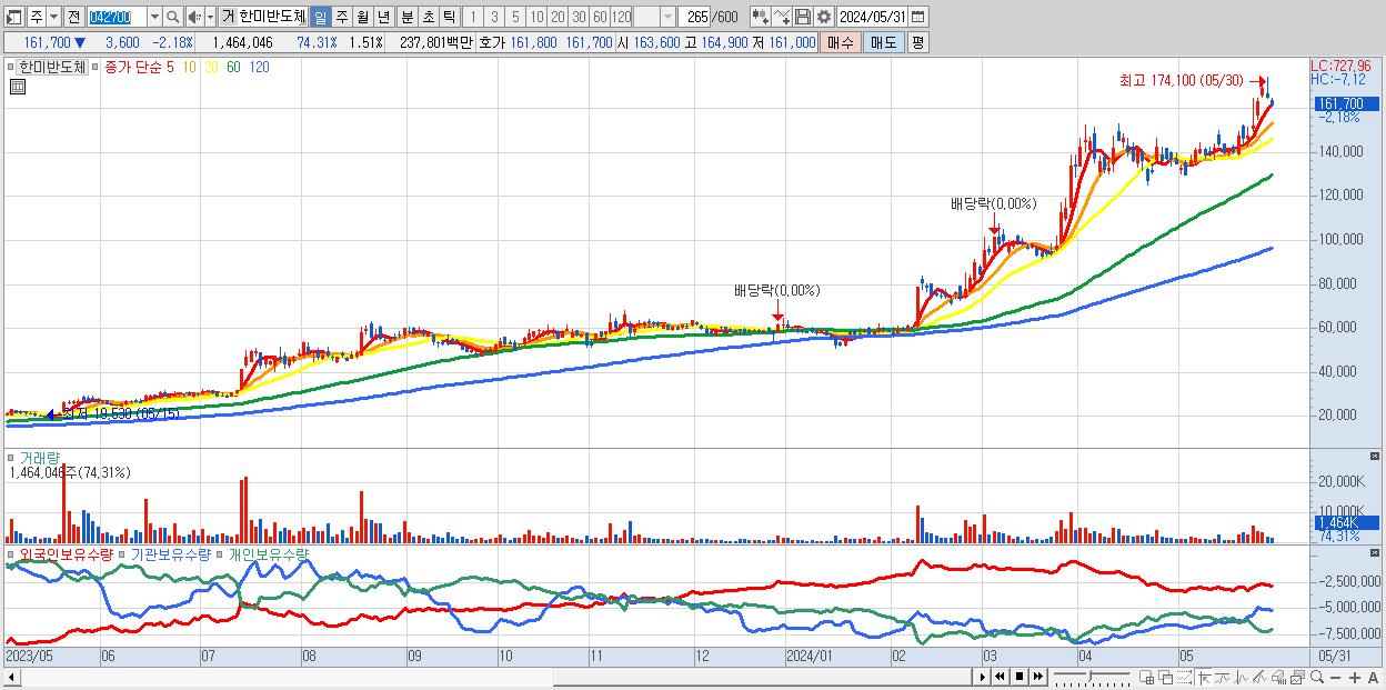 - 한미반도체 (161,700원 ▼ -2.18% , 시총: 156,839억, 거래량: 1,464,046, 거래대금:2,378억)