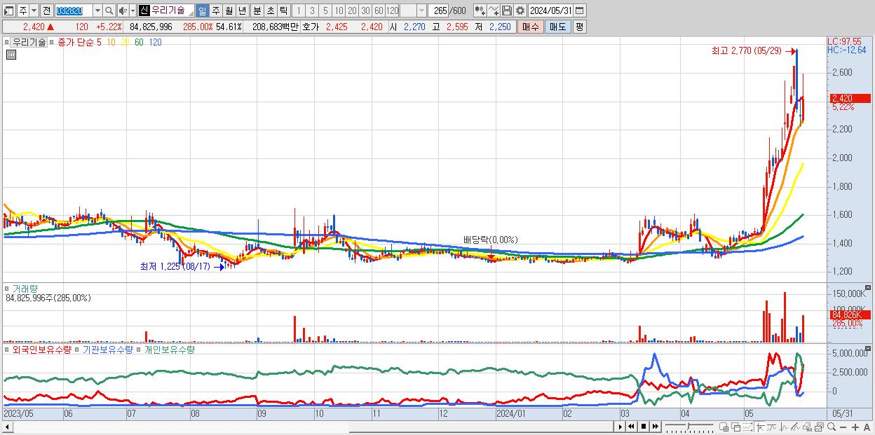 - 우리기술 (2,420원 ▲ 5.22% , 시총: 3,759억, 거래량: 84,825,996, 거래대금:2,087억)