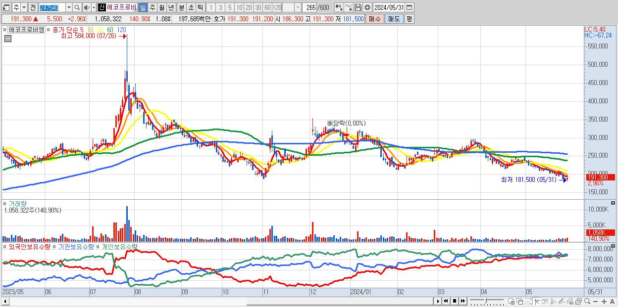 - 에코프로비엠 (191,300원 ▲ 2.96% , 시총: 187,094억, 거래량: 1,058,322, 거래대금:1,977억)