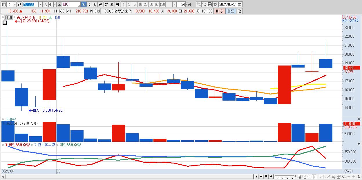 - 삐아 (18,490원 ▲ 1.99% , 시총: 1,790억, 거래량: 11,600,641, 거래대금:2,336억)