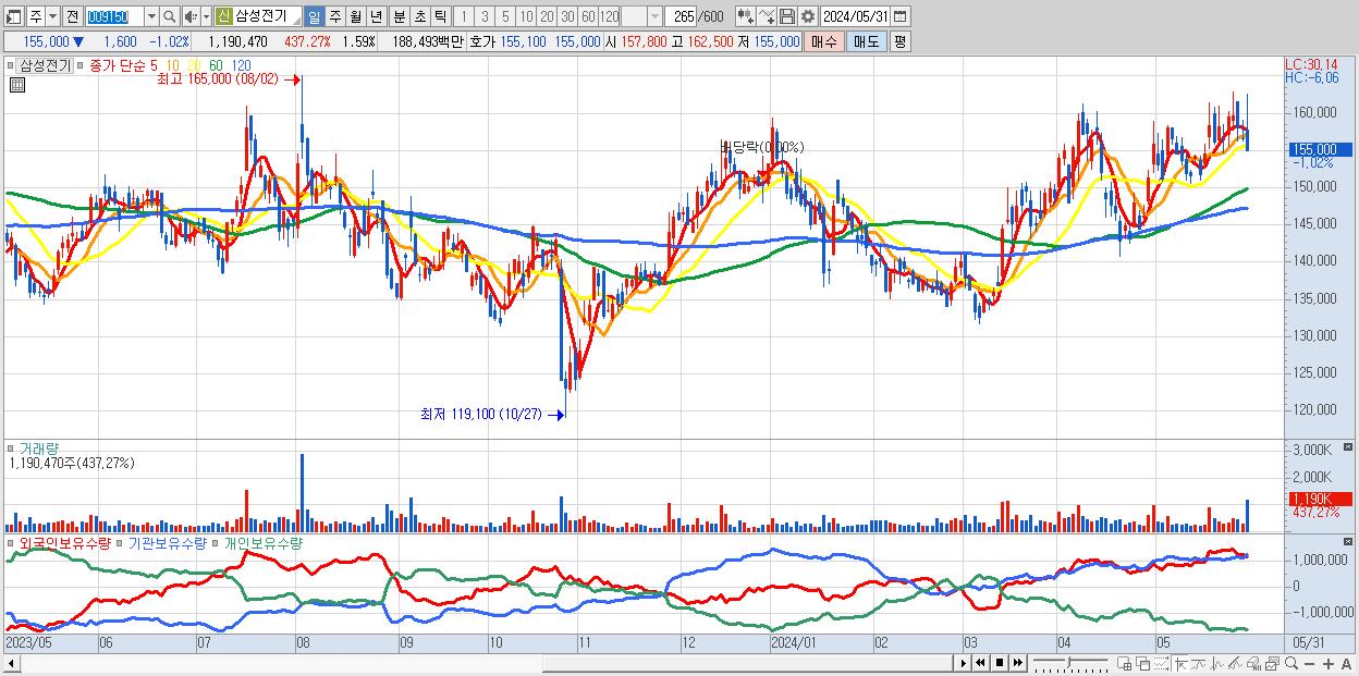 - 삼성전기 (155,000원 ▼ -1.02% , 시총: 115,775억, 거래량: 1,190,470, 거래대금:1,885억)
