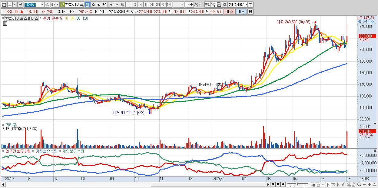 - 한화에어로스페이스 (223,000원 ▲ 8.78% , 시총: 112,905억, 외국인 순매수 거래금:63억)