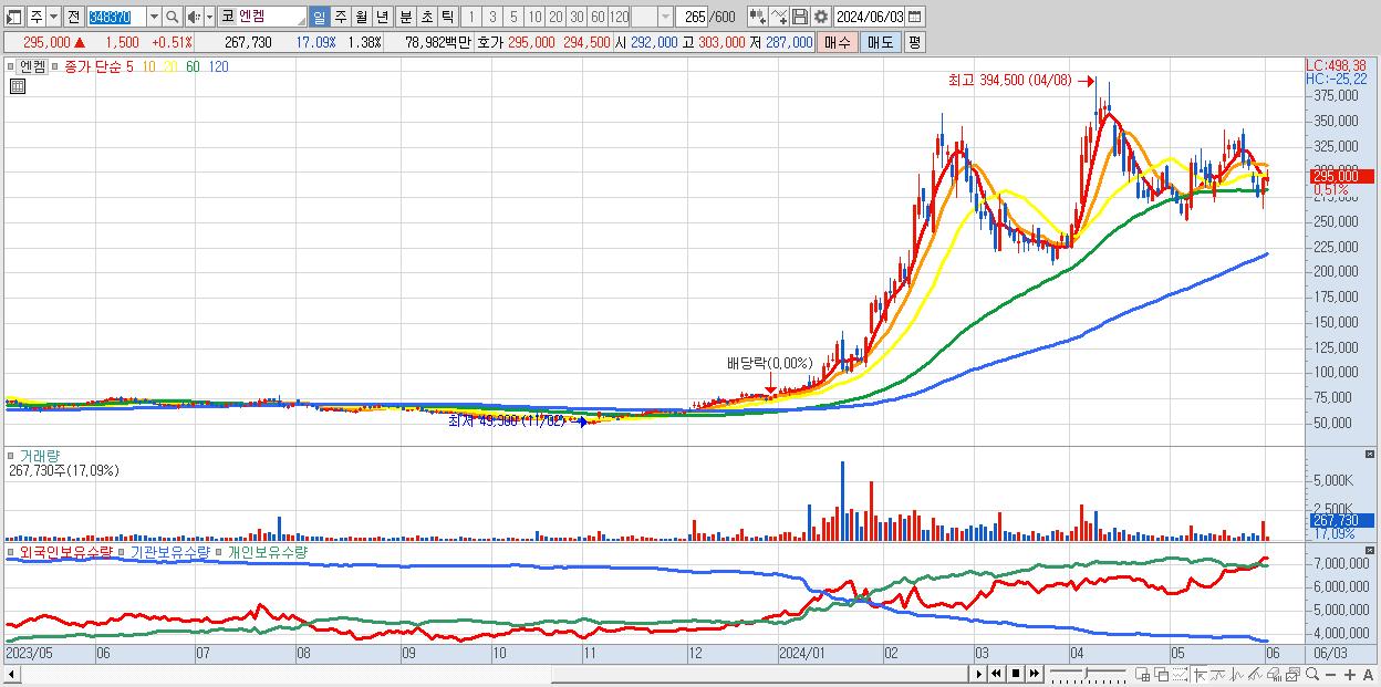 - 엔켐 (295,000원 ▲ 0.51% , 시총: 57,106억, 외국인 순매수 거래금:70억)