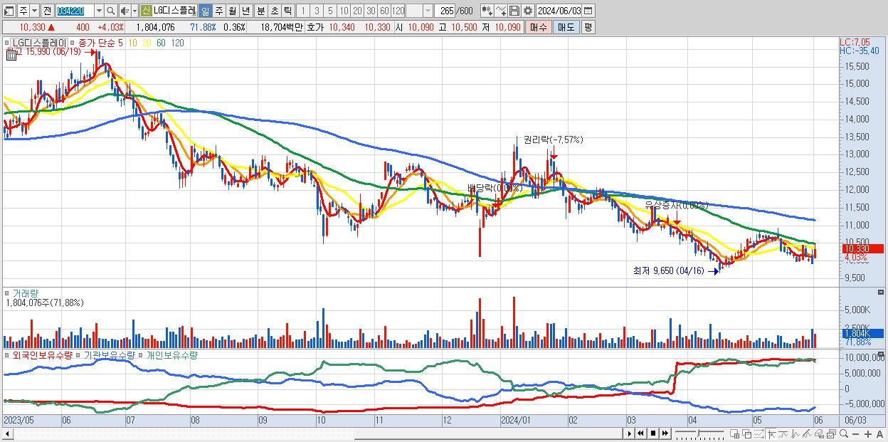 - LG디스플레이 (10,330원 ▲ 4.03% , 시총: 51,650억, 외국인 순매수 거래금:55억)