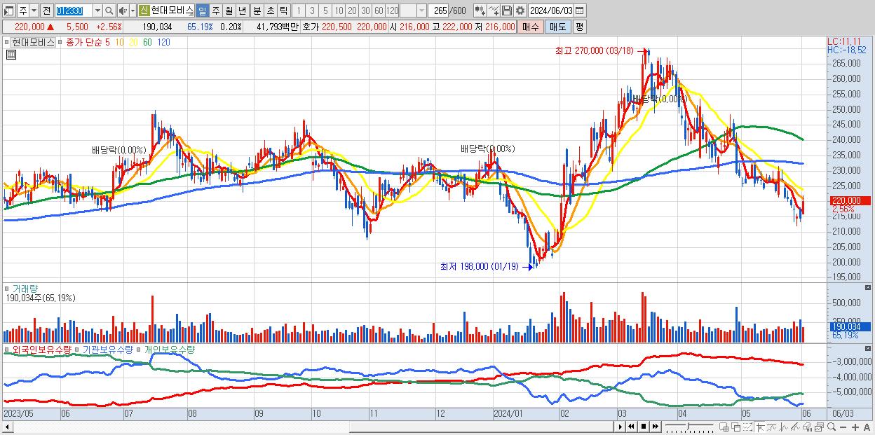 - 현대차 (265,000원 ▲ 4.74% , 시총: 554,953억, 외국인 순매수 거래금:226억)