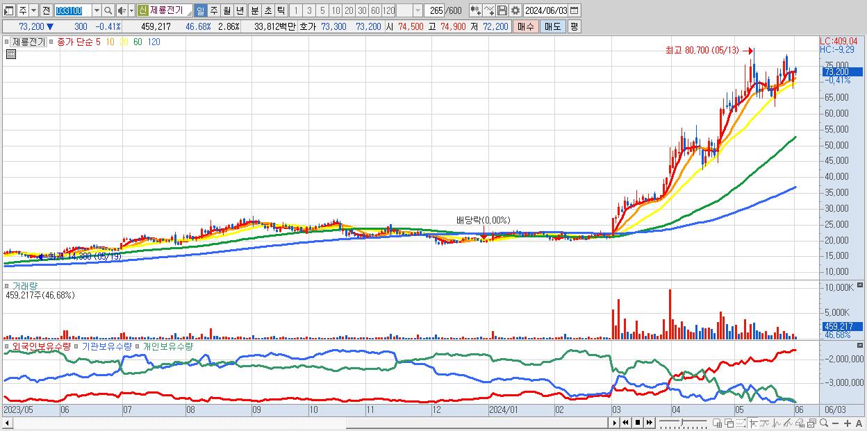 - 제룡전기 (73,200원 ▼ -0.41% , 시총: 11,758억, 외국인 순매수 거래금:68억)