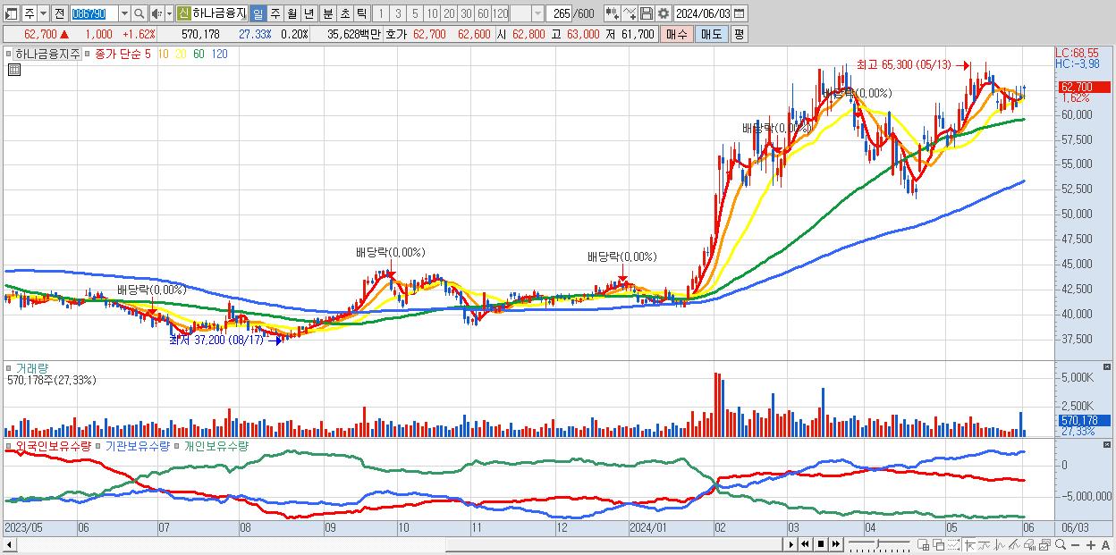 - 하나금융지주 (62,700원 ▲ 1.62% , 시총: 183,308억, 외국인 순매수 거래금:55억)