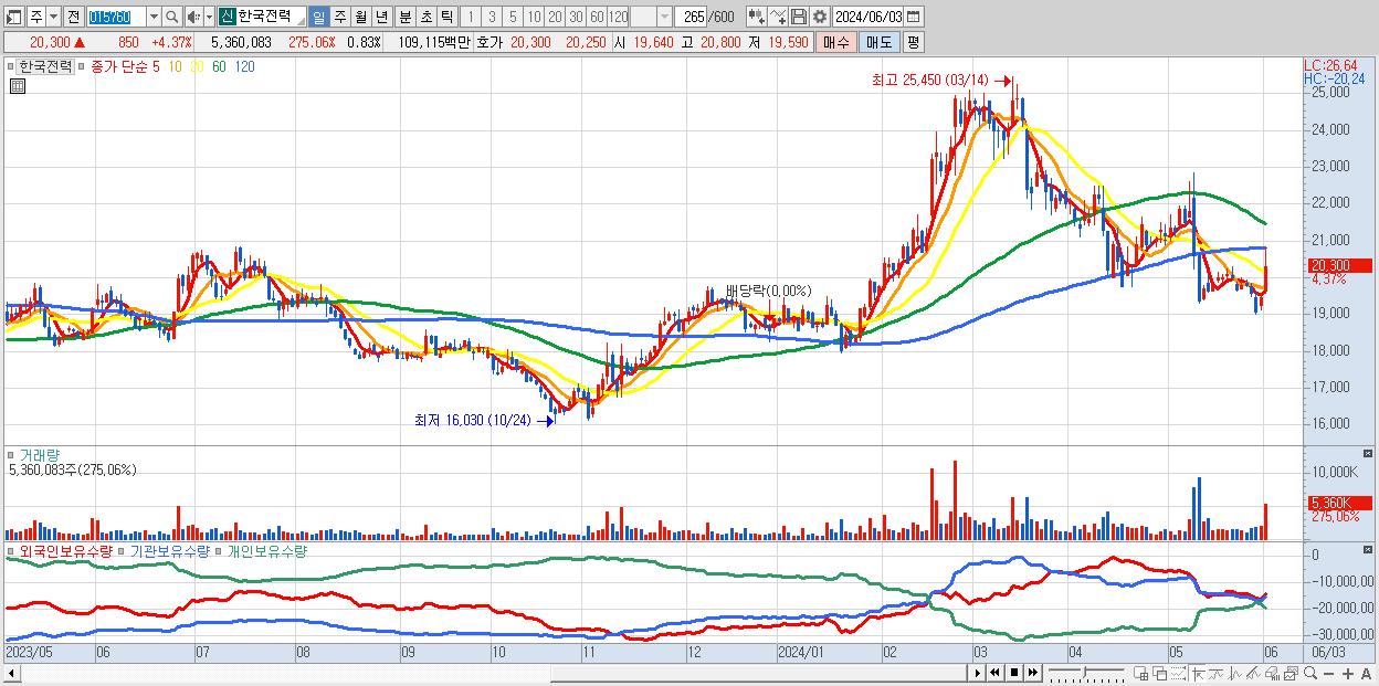 - 한국전력 (20,300원 ▲ 4.37% , 시총: 130,319억, 외국인 순매수 거래금:151억)