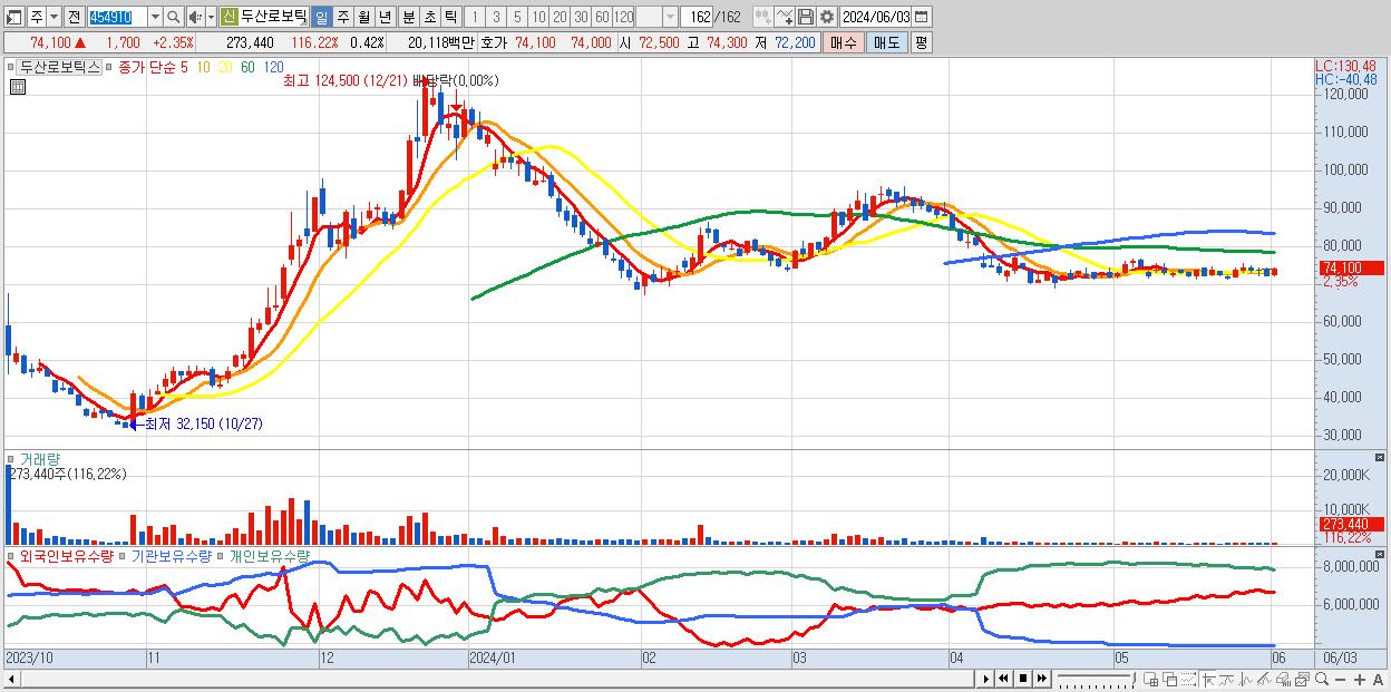 - 두산로보틱스 (74,100원 ▲ 2.35% , 시총: 48,032억, 외국인 순매수 거래금:67억)