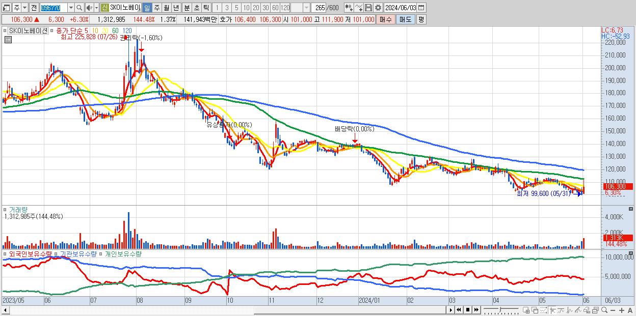 - SK이노베이션 (106,300원 ▲ 6.3% , 시총: 101,767억, 외국인 순매수 거래금:127억)