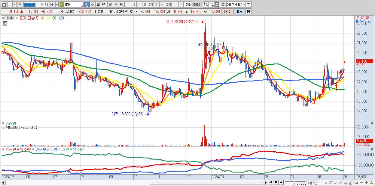 - HMM (19,130원 ▲ 6.28% , 시총: 131,813억, 외국인 순매수 거래금:99억)