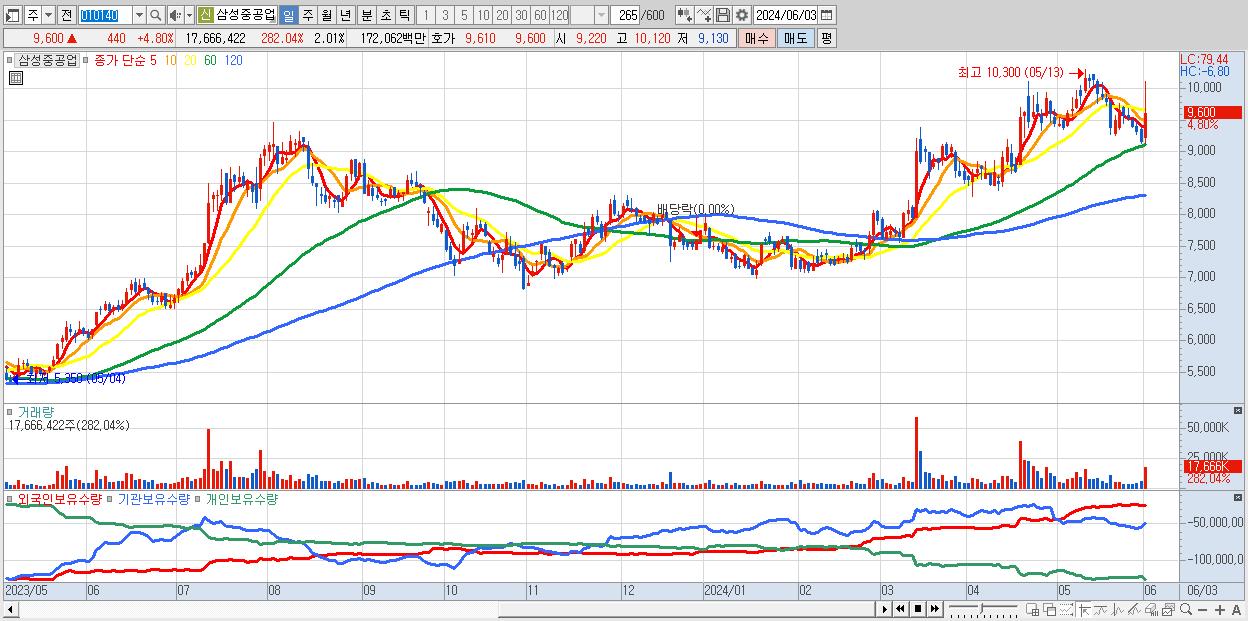- 삼성중공업 (9,600원 ▲ 4.8% , 시총: 84,480억, 외국인 순매수 거래금:223억)