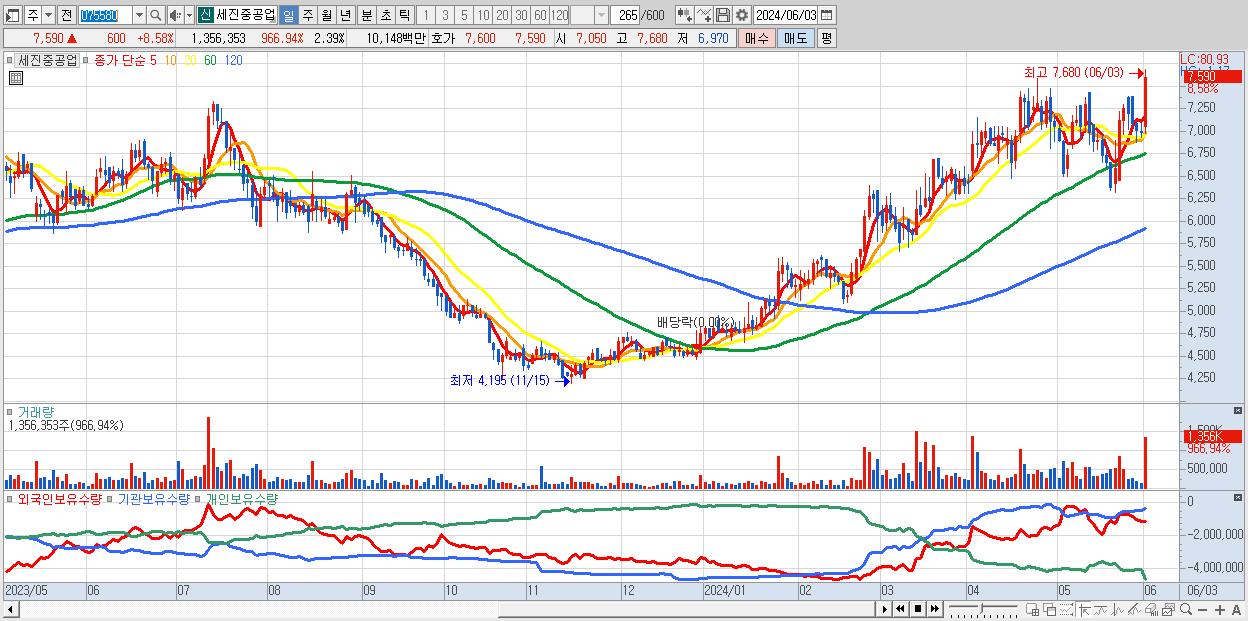 - 세진중공업 (7,590원 ▲ 8.58% , 시총: 4,315억, 거래량: 1,356,353, 거래대금:101억, KOSPI)