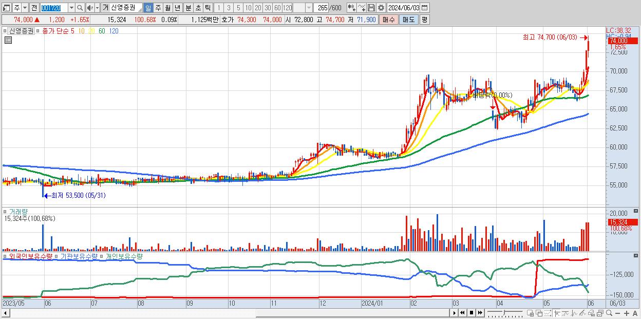 - 신영증권 (74,000원 ▲ 1.65% , 시총: 12,166억, 거래량: 15,324, 거래대금:11억, KOSPI)