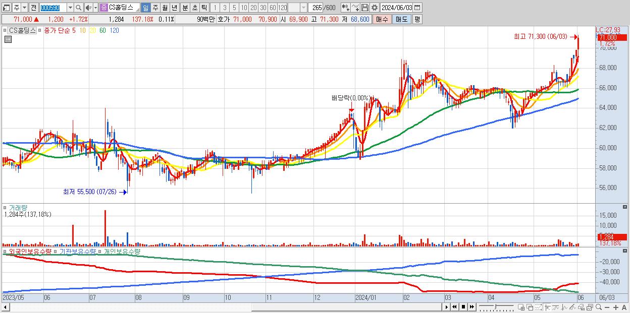 - CS홀딩스 (71,000원 ▲ 1.72% , 시총: 820억, 거래량: 1,284, 거래대금:1억, KOSPI)