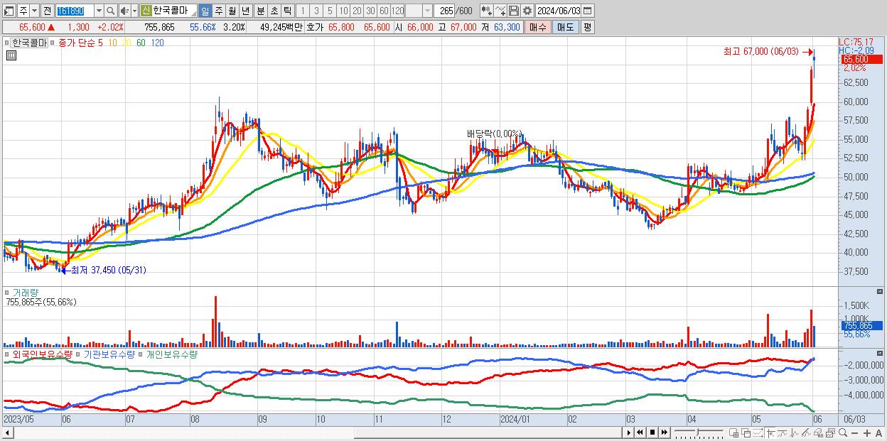 - 한국콜마 (65,600원 ▲ 2.02% , 시총: 15,485억, 거래량: 755,865, 거래대금:492억, KOSPI)