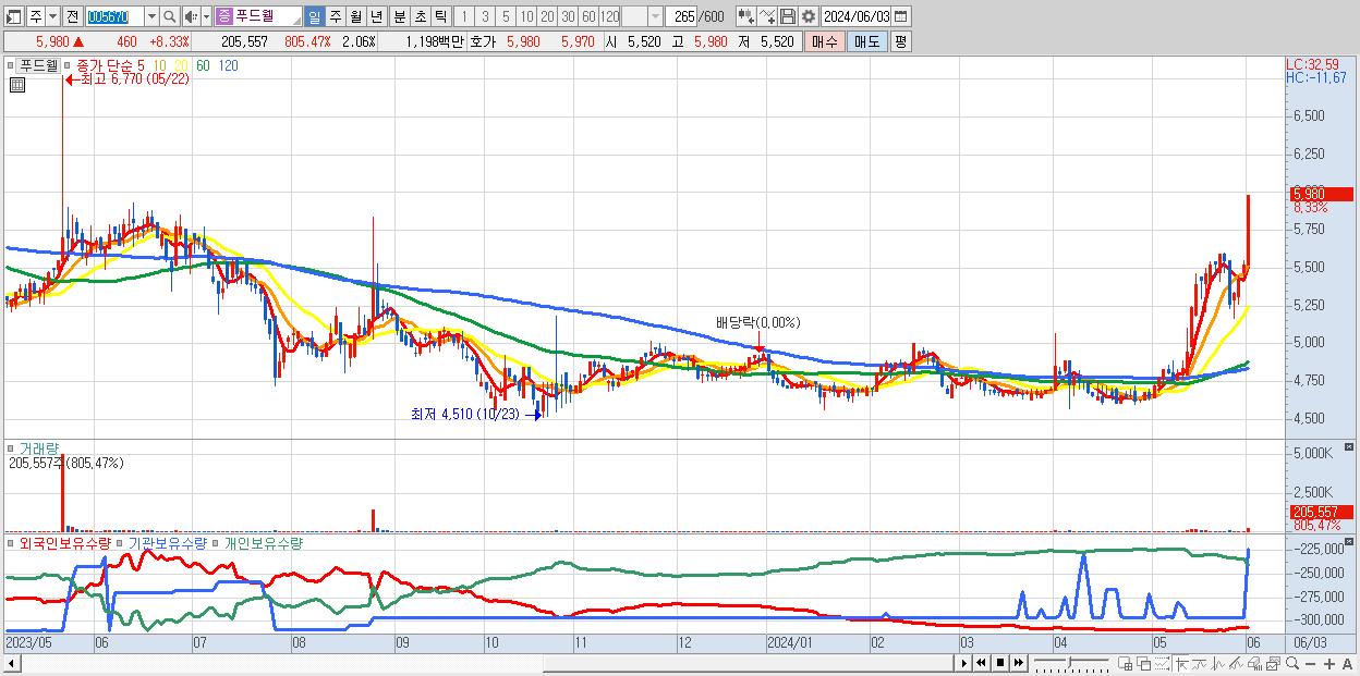 - 푸드웰 (5,980원 ▲ 8.33% , 시총: 598억, 거래량: 205,557, 거래대금:12억, KOSDAQ)
