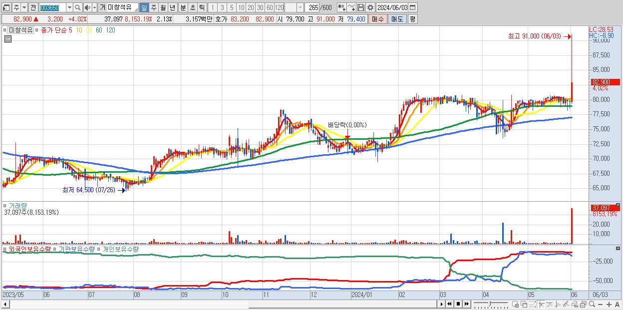 - 미창석유 (82,900원 ▲ 4.02% , 시총: 1,442억, 거래량: 37,097, 거래대금:32억, KOSPI)