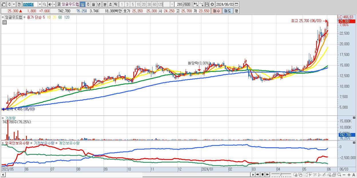 - 잉글우드랩 (25,300원 ▲ 7.66% , 시총: 5,027억, 거래량: 742,780, 거래대금:184억, KOSDAQ)