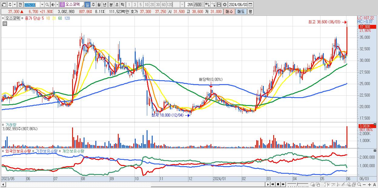 - 오스코텍 (37,300원 ▲ 21.9% , 시총: 14,172억, 거래량: 3,082,993, 거래대금:1,115억, KOSDAQ)
