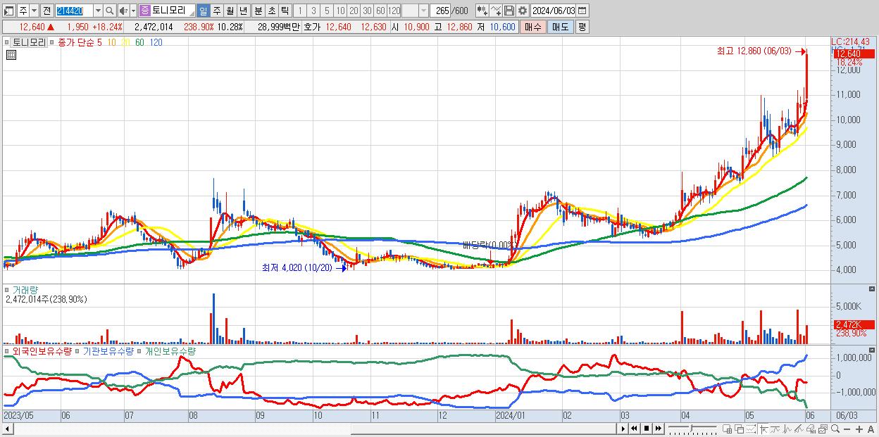 - 토니모리 (12,640원 ▲ 18.24% , 시총: 3,041억, 거래량: 2,472,014, 거래대금:290억, KOSPI)