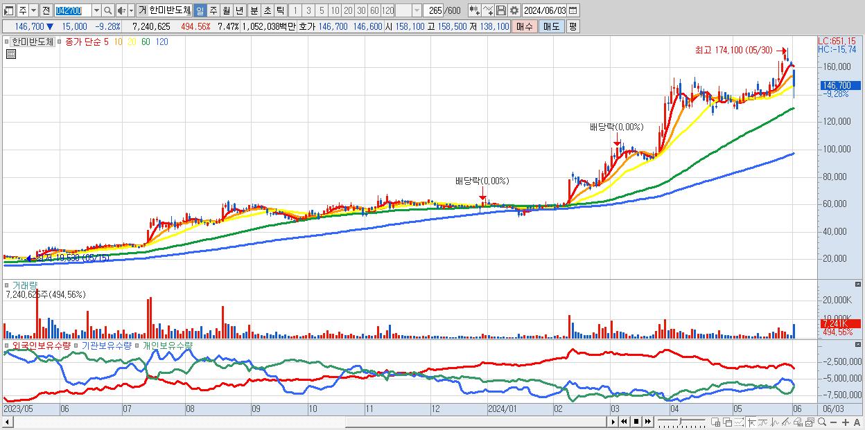 - 한미반도체 (146,700원 ▼ -9.28% , 시총: 142,290억, 거래량: 7,240,625, 거래대금:10,520억)