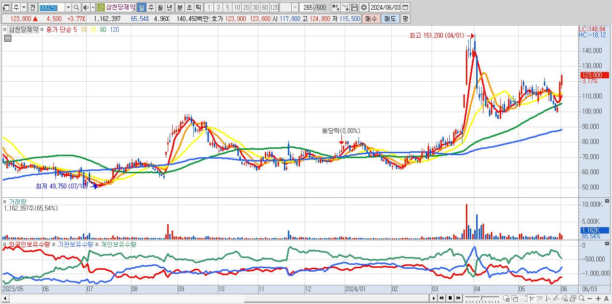 - 삼천당제약 (123,800원 ▲ 3.77% , 시총: 29,040억, 거래량: 1,162,397, 거래대금:1,404억)