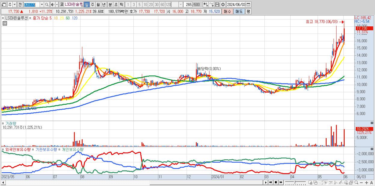 - LS마린솔루션 (17,730원 ▲ 11.37% , 시총: 4,599억, 거래량: 10,291,731, 거래대금:1,806억)