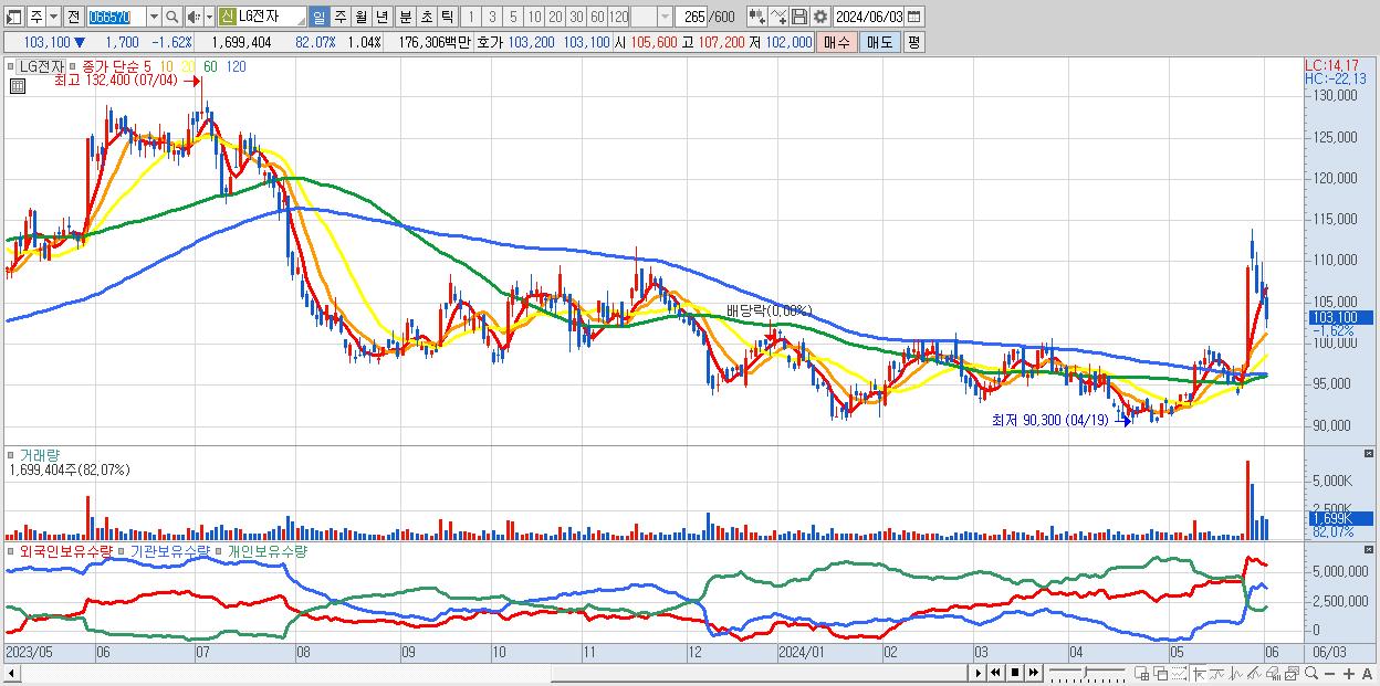 - LG전자 (103,100원 ▼ -1.62% , 시총: 168,721억, 거래량: 1,699,404, 거래대금:1,763억)