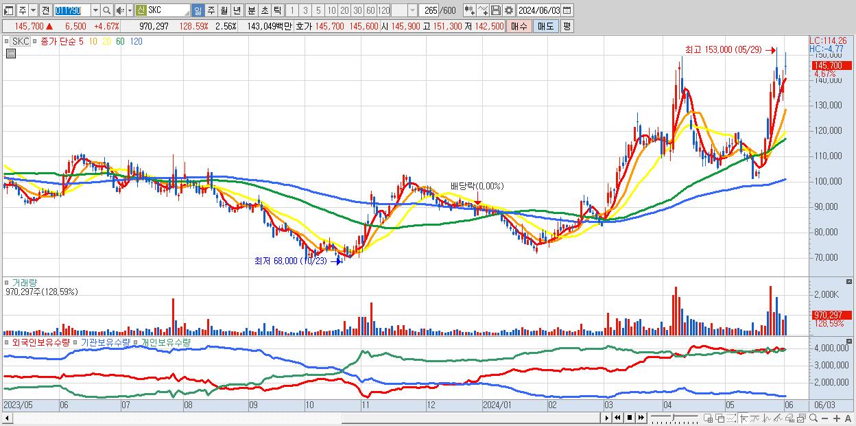- SKC (145,700원 ▲ 4.67% , 시총: 55,174억, 거래량: 970,297, 거래대금:1,430억)