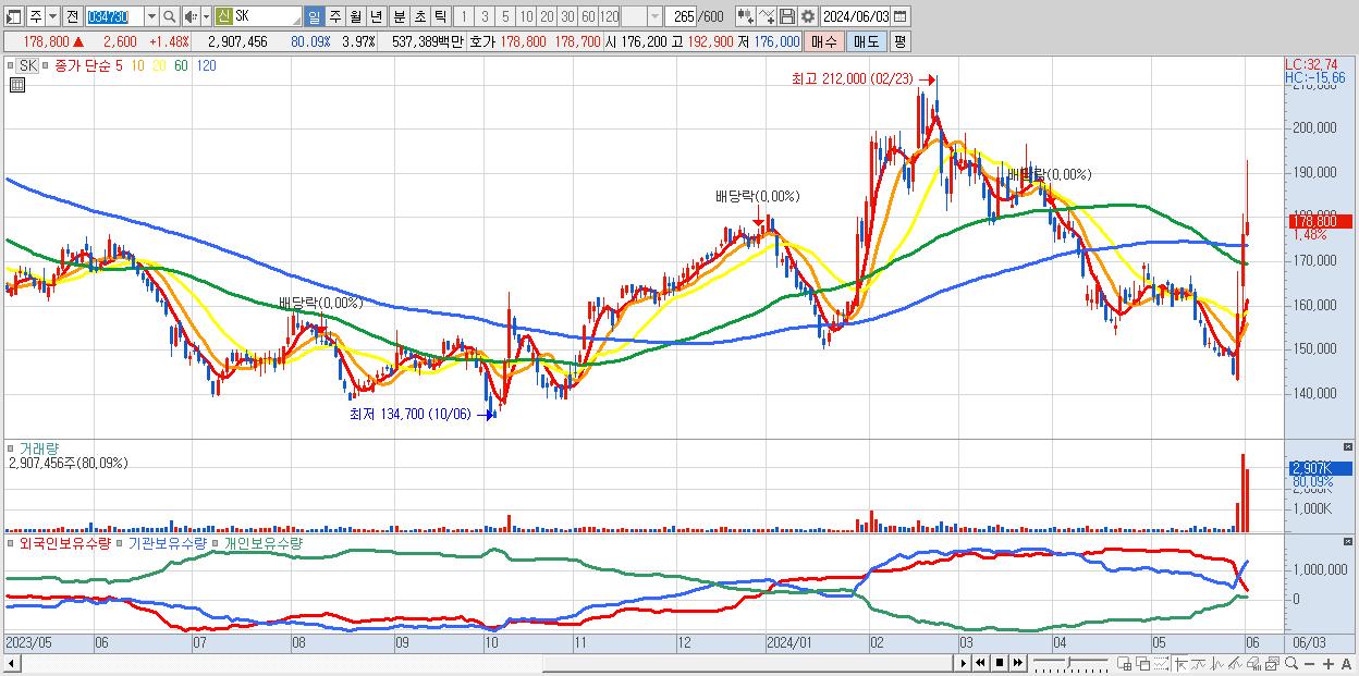 - SK (178,800원 ▲ 1.48% , 시총: 130,879억, 거래량: 2,907,456, 거래대금:5,374억)