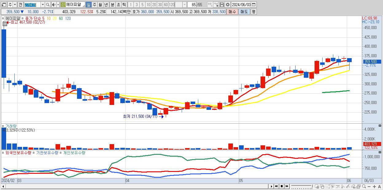 - 에이피알 (359,500원 ▼ -2.71% , 시총: 27,395억, 거래량: 403,329, 거래대금:1,421억)