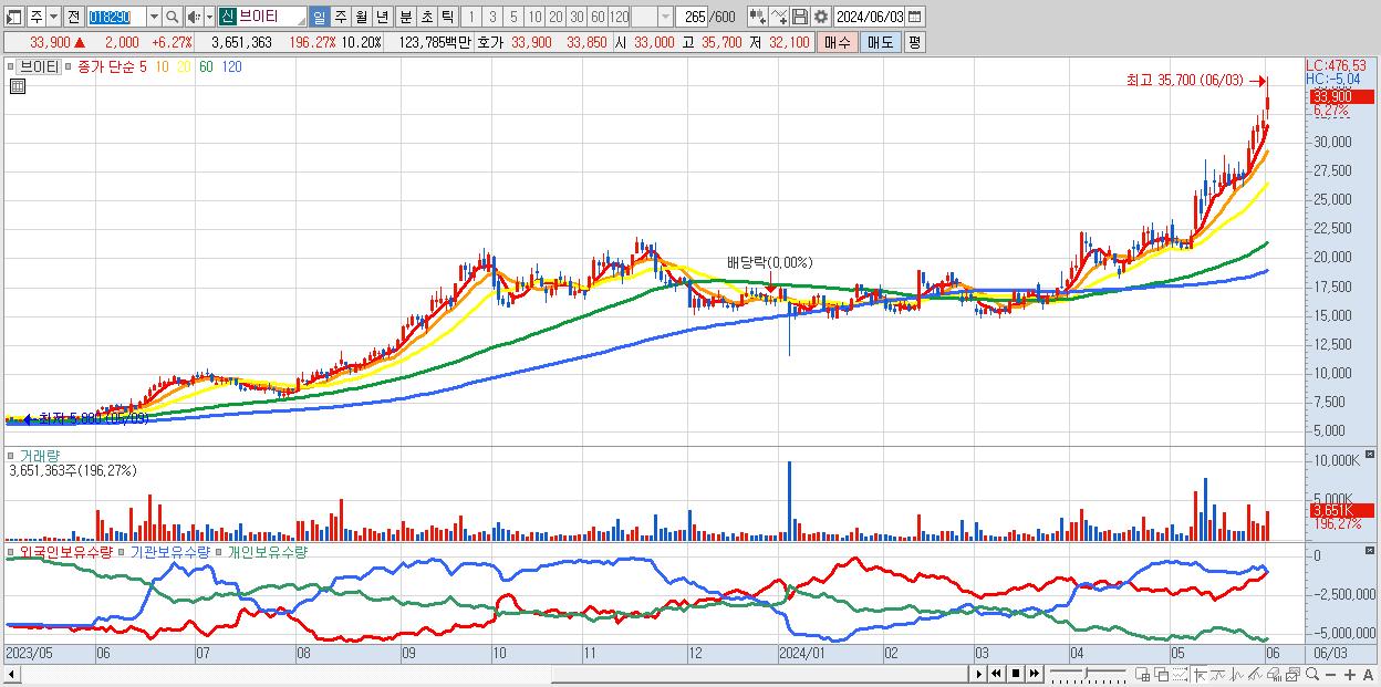 - 브이티 (33,900원 ▲ 6.27% , 시총: 12,136억, 거래량: 3,651,363, 거래대금:1,238억)