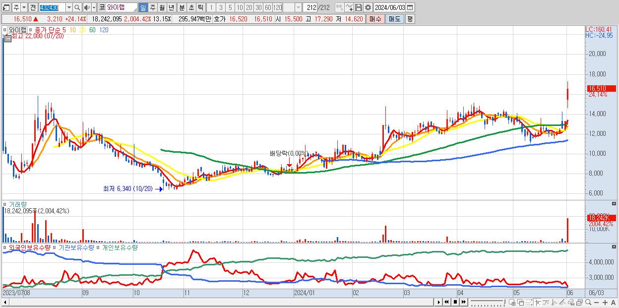 - 와이랩 (16,510원 ▲ 24.14% , 시총: 2,662억, 거래량: 18,242,095, 거래대금:2,959억)