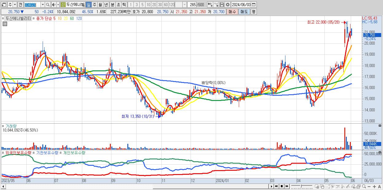 - 두산에너빌리티 (20,750원 ▼ -0.24% , 시총: 132,916억, 거래량: 10,844,092, 거래대금:2,272억)