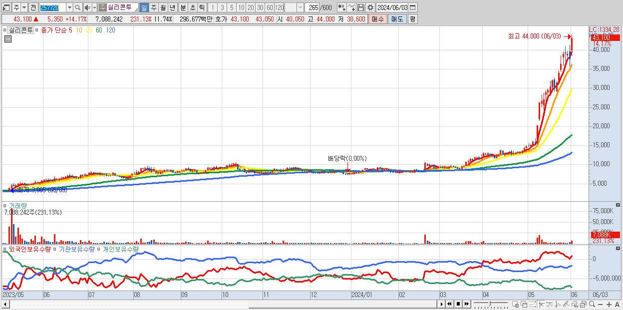 - 실리콘투 (43,100원 ▲ 14.17% , 시총: 26,028억, 거래량: 7,088,242, 거래대금:2,967억)