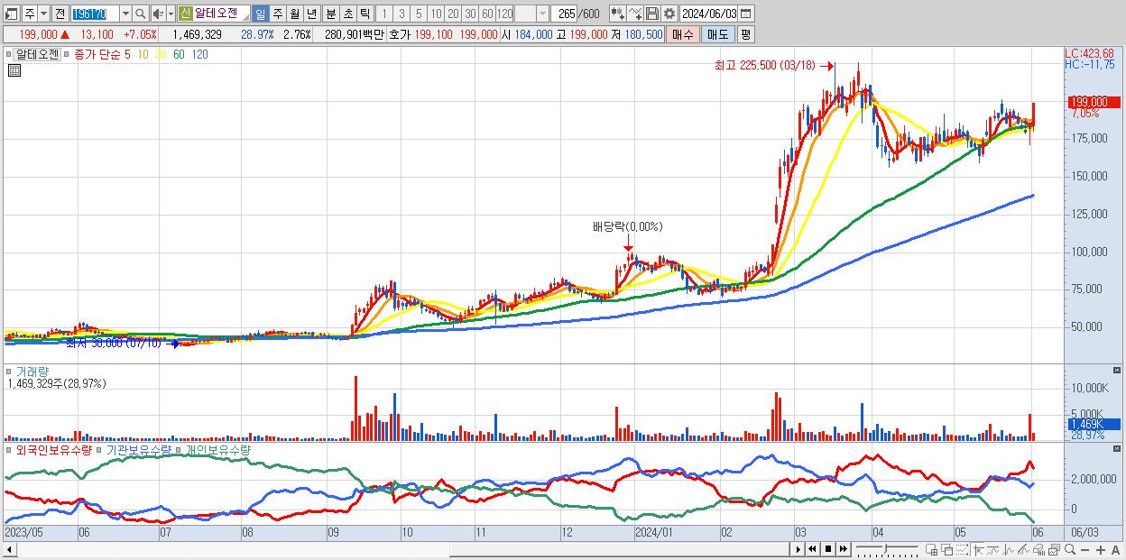 - 알테오젠 (199,000원 ▲ 7.05% , 시총: 105,766억, 거래량: 1,469,329, 거래대금:2,809억)
